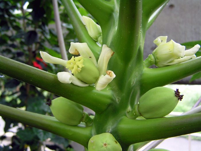 | 形態 | 枝分かれせず、直立する。幹の先端に長い葉柄を持つ大きな葉が集中してつく。葉は深い切れ込みがあり、葉質は薄くて柔らかく、互生する。開花は周年で、葉脇に花をつける。雄花は30~50cmほどの長い花柄を垂らして総状花序をつけ、多数のクリーム色の花を咲かせる。雌花はごく短い花柄の先端にひとつのクリーム色の花を咲かせる。また、雄花雌花を両方つける両性株もある。花後、楕円形の果実を作り、熟すと黄色くなる。 |