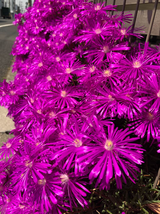 | 形態 | 茎は木質化し、株元から分枝して地上を横に這って成長する。葉は、くすんだ白緑色で、断面がやや三角になった多肉質の短い棒状で、透明な突起に覆われており、対生する。4~11月頃、菊に似た光沢がある鮮やかな濃桃色の花を多数つける。花弁はやや隙間が多く、外側にそり気味に開く。花は日中だけ開いて夜や曇天では閉じる開閉運動を繰り返す。 |