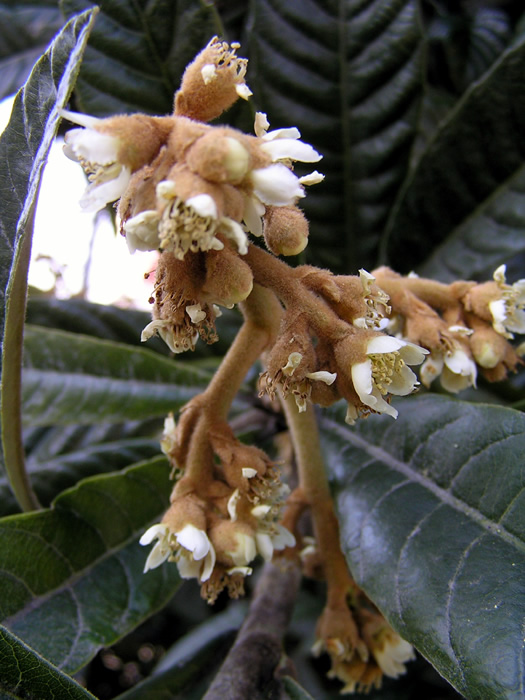 | 形態 | 幹から多くの枝を出し、不整形ないし半球の樹形になる。小枝は太く毛が多い。葉は互生し、葉柄は短い。葉は長楕円形で厚くて堅く、表面が葉脈ごとに波打つ。縁には波状の鋸歯があり、裏に毛が密生する。11~翌1月頃、当年枝の先端に円錐花序を作り、芳香のある白い花を咲かせる。花弁は5枚。葯には毛が密に生えている。自家受粉が可能で、6月頃に卵形をした黄橙色の実をつける。果実は梨状果で、全体が薄い産毛に覆われている。 |