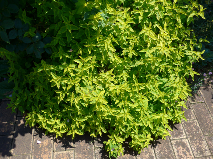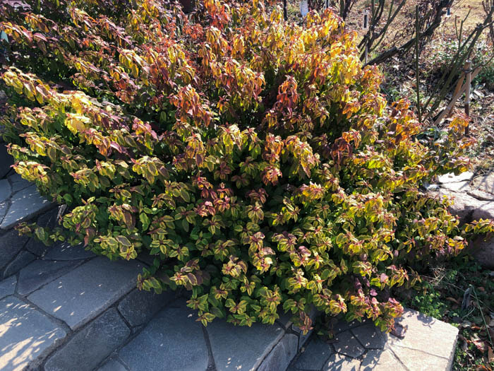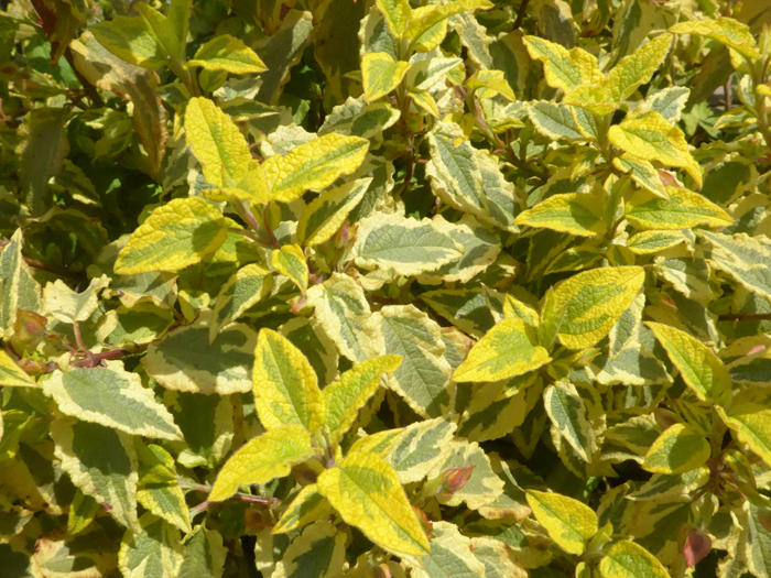 | 形態 | 葉は明緑色で、縁に薄黄色の斑が入る。冬季には全体が赤味がかる。花色は白。 |