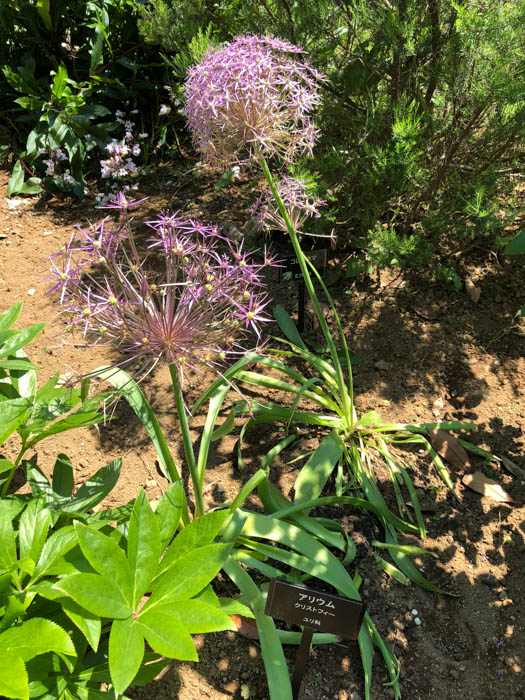 | 形態 | 地下部に鱗茎ができる。早春に萌芽、地際から広披針形の葉を叢生する。葉は直立し、先端は垂れる。5~6月頃、花茎を立ち上げ、茎頂に袋状の総苞で包まれた花序ができ、総苞が開いて花を咲かせる。花序は球形。花被片はメタリックな薄赤紫色で、披針形で、6枚が平開して星形になる。花が咲く頃には葉はやや黄色く枯れはじめている。夏に地上部が枯れ、休眠する。 |