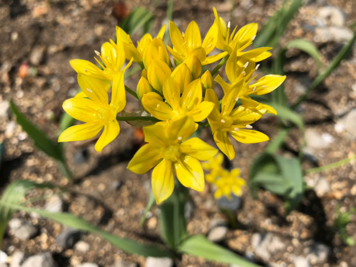| 形態 | 地下部に鱗茎ができる。春に萌芽、地際から先が尖った扁平な紐状の葉を叢生する。葉はややくすんだ緑色で、日向では直立するが、日陰では倒れる。5~6月頃、花茎を立ち上げ、茎頂に袋状の総苞で包まれた花序ができ、総苞が開いて散形に十数個の花を咲かせる。花被片は黄色で中央に緑色の筋が入り、6枚が半開する。果実は蒴果。初夏には地上部が枯れ、休眠する。 |