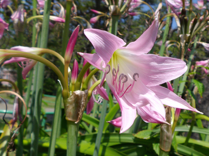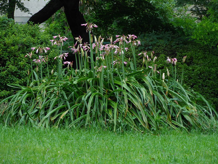 | 形態 | 地下部に鱗茎ができる。葉はやや光沢がある明緑色で、先が尖った帯状で、基部は重なって偽茎になる。6~7月頃、花茎を立ち上げ、茎頂に散形花序を作り、細めのラッパ形の花を8〜15個咲かせる。花被片は6枚で淡いピンク色。雄しべ6本、雌しべ1本が上向きに湾曲する。花糸の色はピンク色、葯の色は紫がかったグレー~ベージュ色。 |