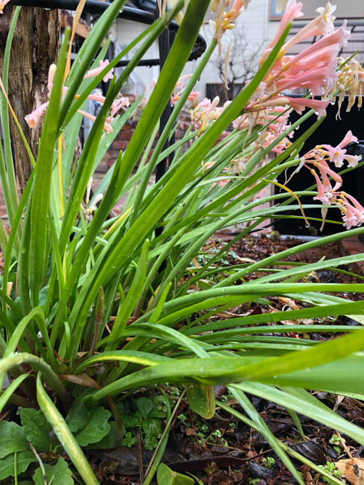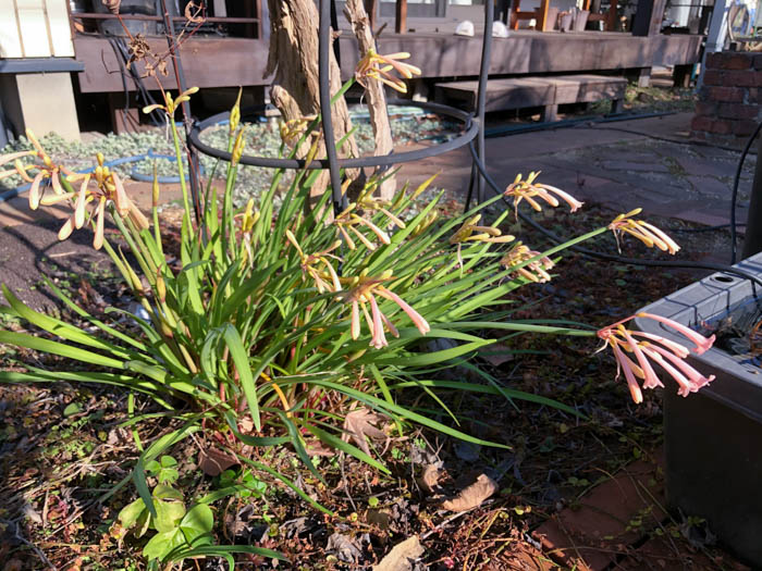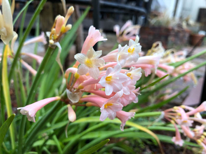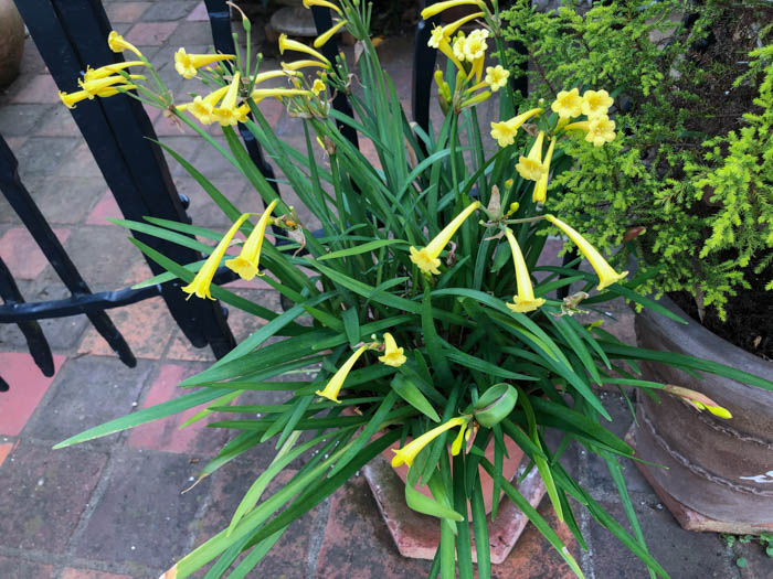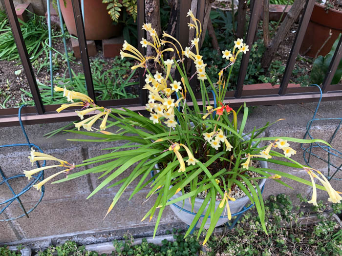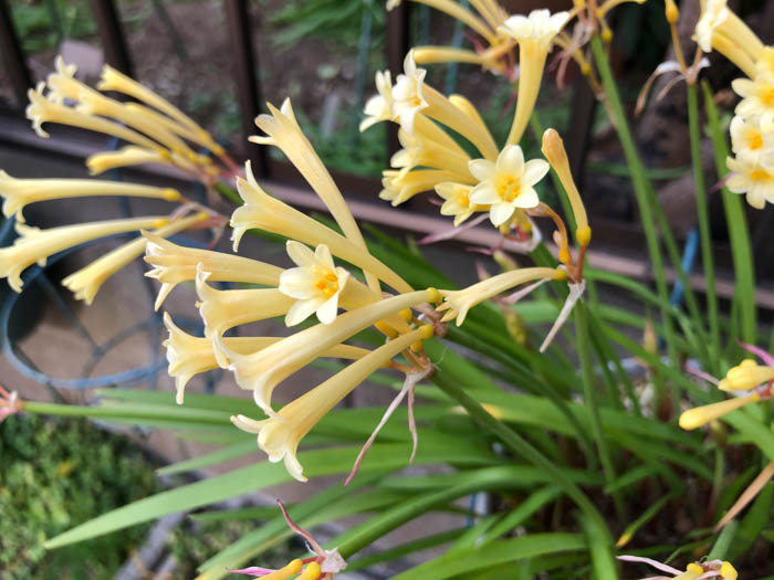 | 形態 | 地際から扁平な紐状の葉が叢生する。年末から翌年5月頃、花茎を立ち上げ、茎頂に散形花序を作り、8〜15個の淡黄色〜白色の花を咲かせる。花は細長い筒状で、先端は6裂して平開する。花には芳香がある。受粉は夜間、蛾によってなされる。果実は長球形の蒴果。 |