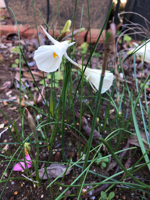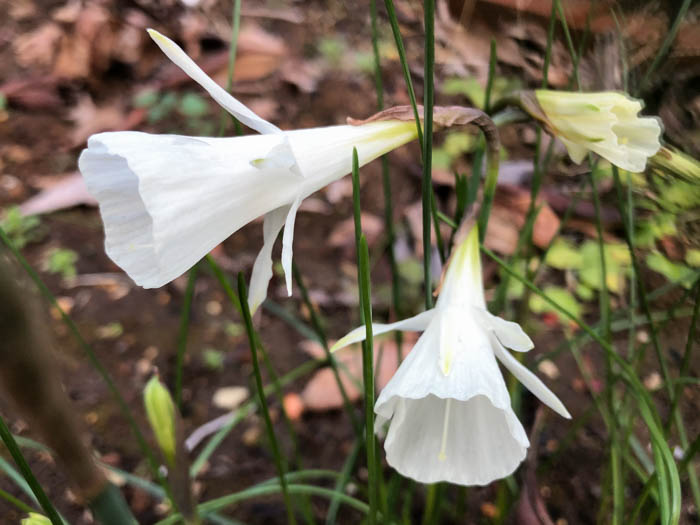 | 形態 | 地下部に鱗茎ができる。秋に萌芽、地際から肉厚な針状の葉が叢生する。11月~翌1月頃、花茎を立ち上げ、茎頂に花を横〜斜め上向きに咲かせる。花の中央部の副花冠は大きな漏斗形で、その周囲を披針形の小さい花被片が6枚囲んで平開する。花被片と副花冠の色は同色で、白色。果実は蒴果。初夏に、地上部が枯れて休眠する。 |