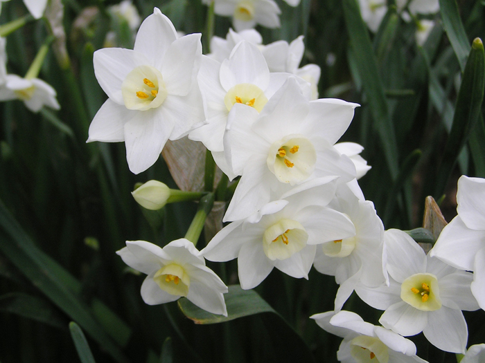 | 解説 | 原種「ナルキッスス・タゼッタ」の特徴をもつ。なお、「ニホンズイセン」は「ナルキッスス・タゼッタ」の変種。 1茎に3~50の花をつける。葉はやや肉厚で扁平な紐状で、粉白を帯びた緑色。花被片は平開し、副花冠はカップ形。花には芳香がある。 |