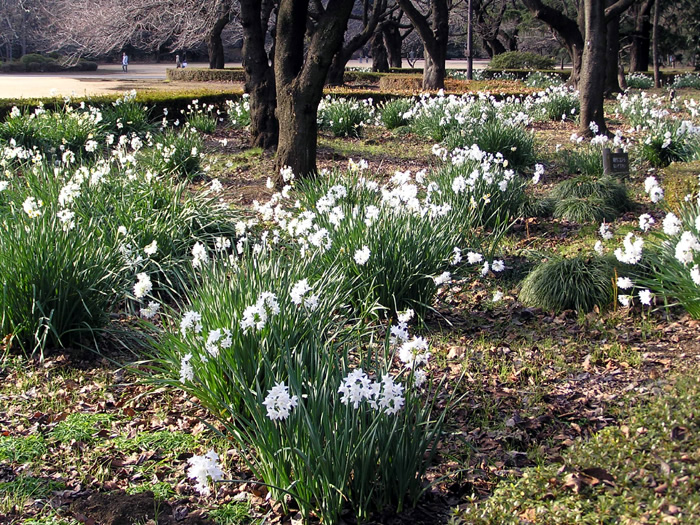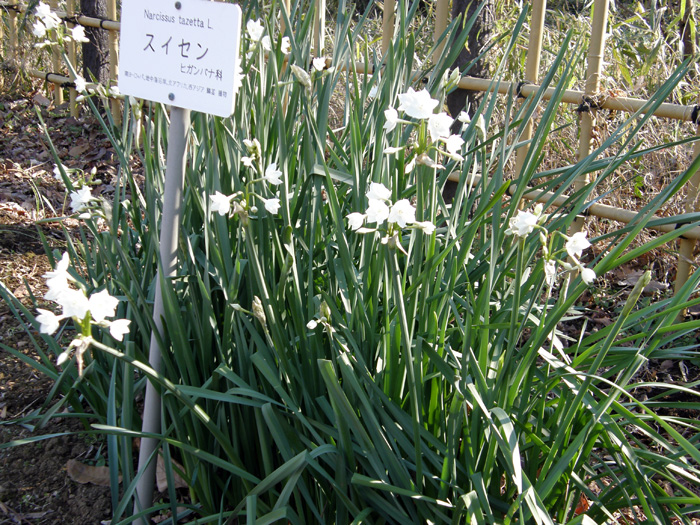 | 形態 | 地下部に鱗茎ができる。晩秋に萌芽、地際からやや肉厚で扁平な紐状の葉が叢生する。葉は粉白を帯びた緑色で、先端は鈍頭。12~3月頃、花茎を立ち上げ、茎頂に3~20個の花を横向きに咲かせる。蕾は薄い膜状の苞に包まれている。花被片は6枚で、ややすぼまり気味に平開し、中央部の副花冠はカップ形。花被片と副花冠の色は同色で、白色。花には芳香がある。初夏に、地上部が枯れて休眠する。 |