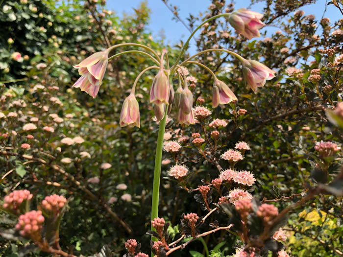 | 形態 | 地下部に鱗茎ができる。早春に萌芽、地際から扁平な紐状の葉が叢生する。葉は断面が三角形で、よじれ、先端は垂れる。5月頃花茎を立ち上げ、茎頂に放射状の散形花序を作り、長い花柄の先にベル形の花を多数下向きに咲かせる。花被片は6枚で、周囲がピンクベージュ色で中央が臙脂色、基部は緑色。花が咲く頃には葉はやや黄色く枯れはじめている。花後、地上部が枯れ、休眠する。果実は蒴果。植物を切ると、ニンニクに似た匂いがする。 |