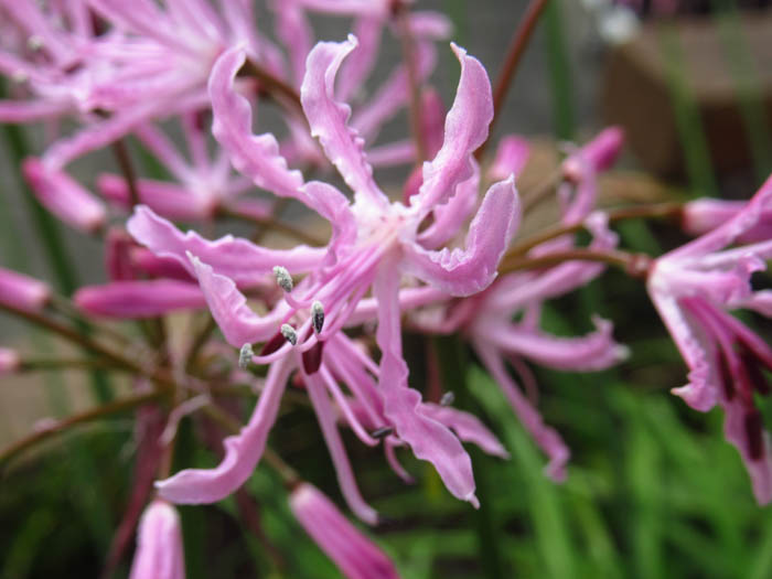 | 形態 | 地下部に鱗茎ができる。葉は扁平な紐状で、地際から叢生する。葉先は垂れ下がる。11〜12月頃花茎を立ち上げ、茎頂に、放射状の散形花序を作り、ピンク色の花を、数個〜十数個咲かせる。花被片は6枚。漏斗状〜ほぼ平開し、縁は波打つ。花糸はピンク色で、葯は暗ピンク色。 |
