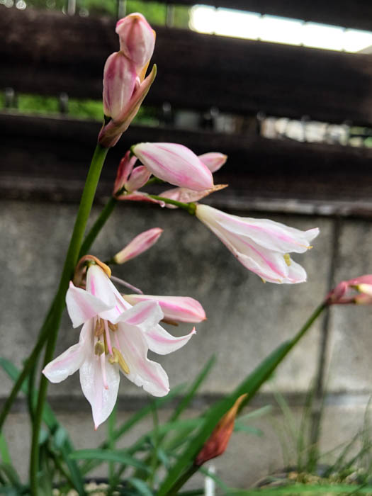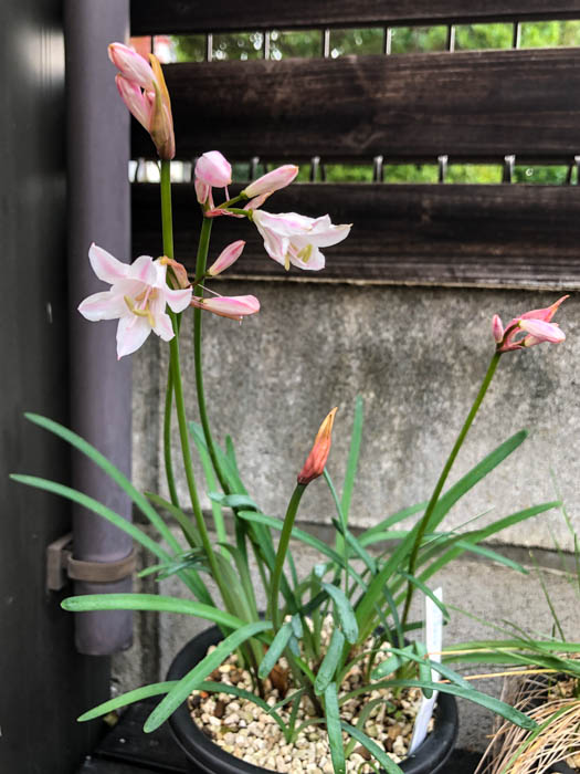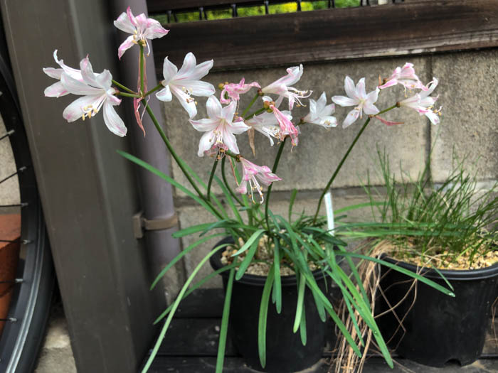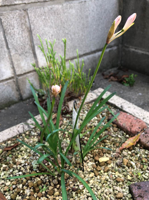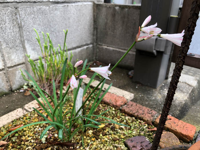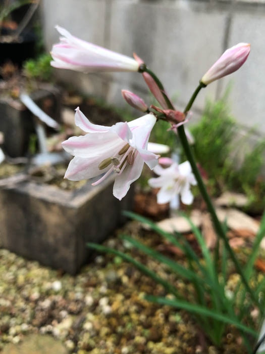 | 形態 | 地下部に鱗茎ができる。秋に萌芽、地際から扁平な紐状の葉が叢生する。11〜12月頃花茎を立ち上げ、茎頂に、放射状の散形花序を作り、淡いピンク色の花を、3〜7個咲かせる。花被片は6枚。淡ピンクで中央にピンク色の筋が入る。花後も葉は残り、5〜6月頃に地上部が枯れて休眠する。 |