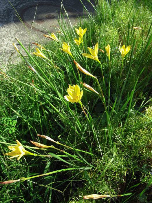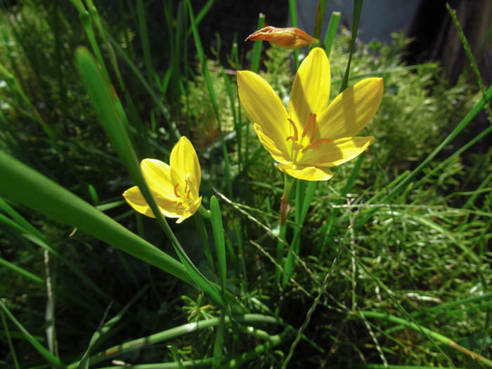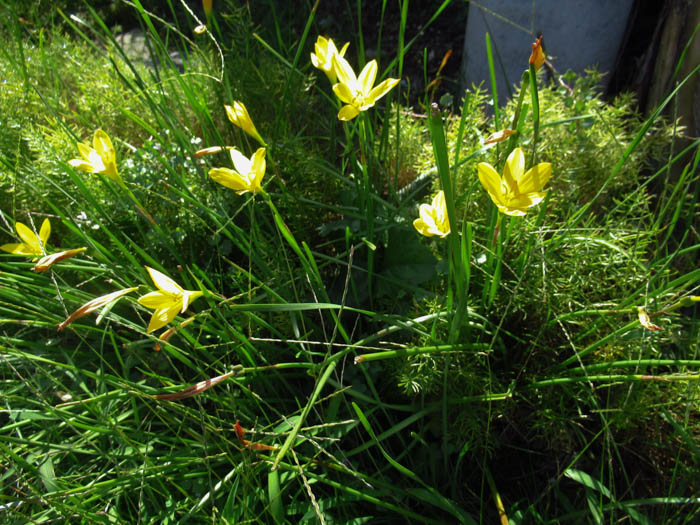 | 形態 | 地下部に鱗茎ができる。9~10月頃萌芽、葉と花茎を同時に立ち上げる。葉は扁平な紐状で、地際から叢生する。鱗茎から3~5本の花茎が出て、茎頂に鮮黄色の花を1個咲かせる。花被片は6枚で、すぼまり気味に開く。花後も葉は残り、5〜6月頃に地上部が枯れて休眠する。 |