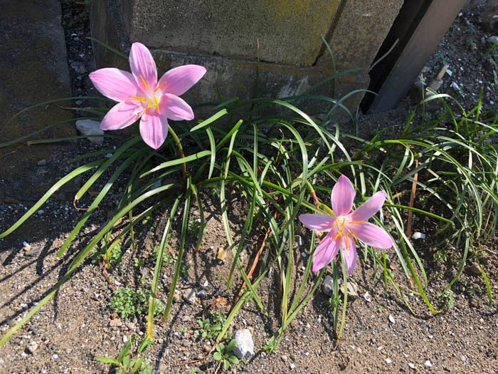| 形態 | 地下部に鱗茎ができる。春に萌芽、地際から肉厚で扁平な紐状の葉が叢生する。6〜10月頃、花茎を立ち上げ、茎頂にピンク色の花を1個咲かせる。花被片は淡~濃ピンク色で基部が白、6枚が平開する。雄しべは6個で、T字形に長い葯がつき、葯の色は橙黄色。雌しべは白く、まっすぐ伸びて突き出て、先端は3〜5裂する。果実は蒴果。 |