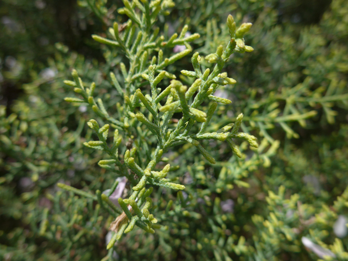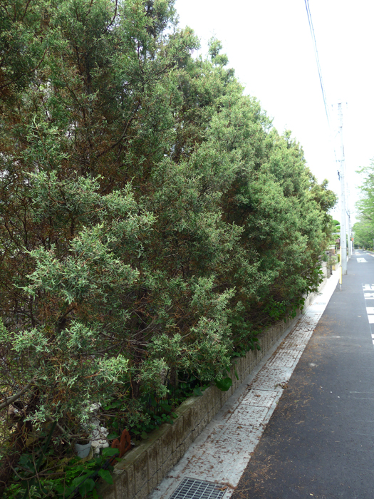 | 形態 | 幹は直立し、樹形は円錐形になる。樹皮は赤褐色で縦に紙がめくれるように剥離する。側枝は水平または斜上で、地面近くまで広がる。葉は淡緑から灰緑色で、鱗片状で細い糸状になり、表裏の区別は無い。葉には独特の芳香がある。雌雄異花で、3〜4月頃、枝先に雌花と雄花をそれぞれ単生する。雄花は長球形で明るい茶褐色、雌花は鱗片状で薄茶色の葉の塊のよう。果実は球形の球果で、受粉後、翌年の10月頃に灰褐色に熟す。 |