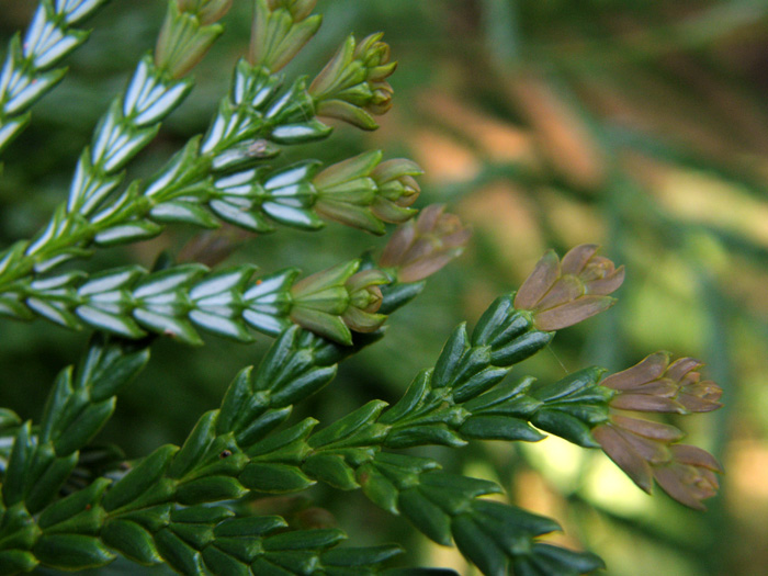 | 形態 | 幹は直立し、樹形は円錐形になる。樹皮は灰褐色で縦に長く裂け、芳香がある。側枝は水平または斜上。葉は濃緑色で、肉厚で平たい鱗片状で先端は爪のように尖り、裏面に4本の白色の気孔線が扇形に見える。雌雄異花で、早春に枝先に雌花と雄花をそれぞれ単生する。果実は不整形なぼこぼこした球果で、灰褐色に熟す。 |