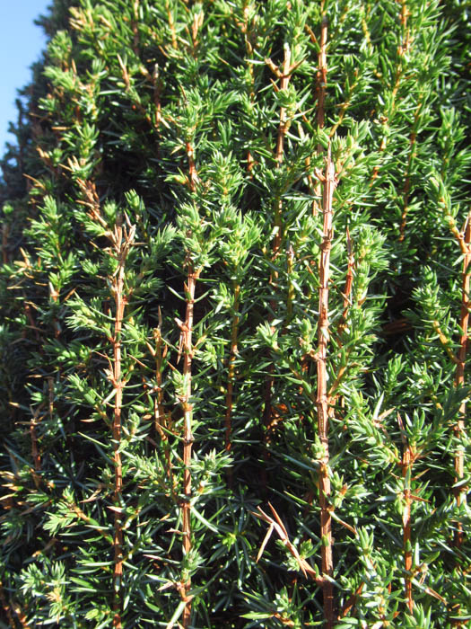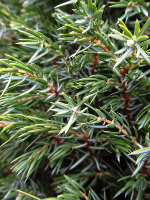 | 形態 | 樹形は不整形。幹はねじれることが多い。環境や品種により円錐形や円柱形に育つものもあるが、横に這い広がるものもある。樹皮は茶褐色で縦に長く裂ける。葉は先端が鋭く尖った硬い針状で、光沢があり、3輪生する。葉の表面中央に、白く広めの気孔線が入る。雌雄異株で、3〜4月頃、それぞれ枝先の葉腋に雌花や雄花をつける。雄花は卵形で明るい黄褐色、雌花は鱗状の長球形で薄黄緑色。果実は球形の球果で、若いうちは白緑色で、1年半で成熟すると、ワックス質に覆われた黒紫色になる。球果は木質ではなくやや肉質の液果状になる。 |