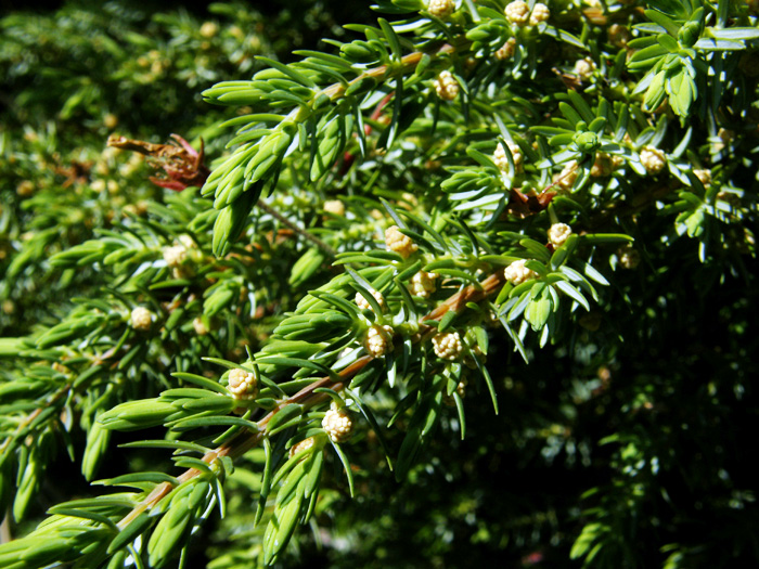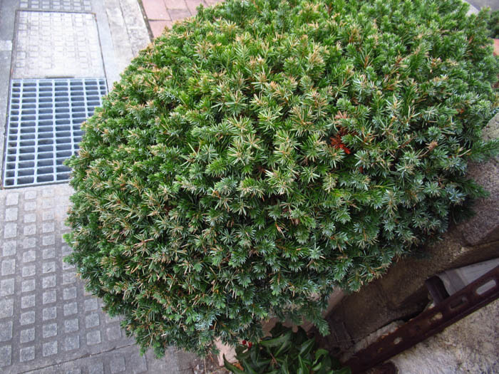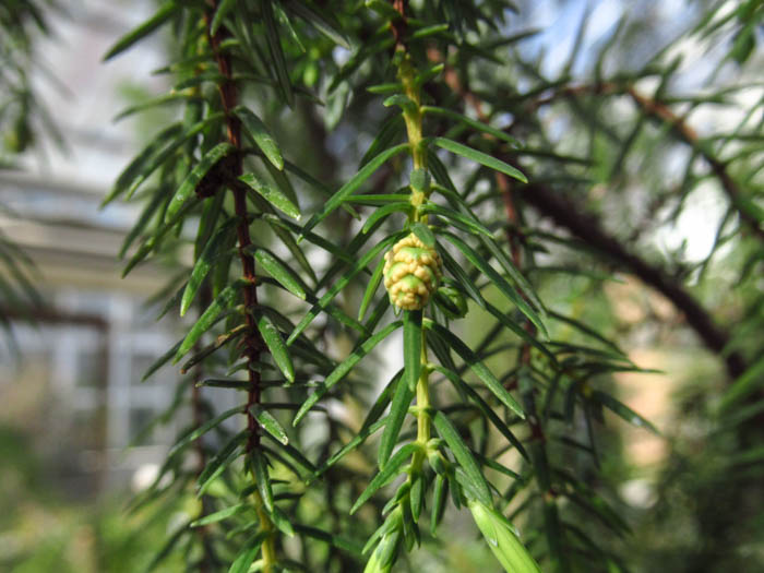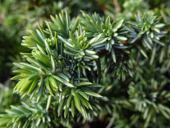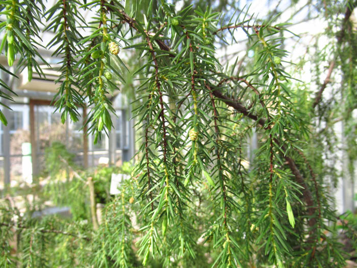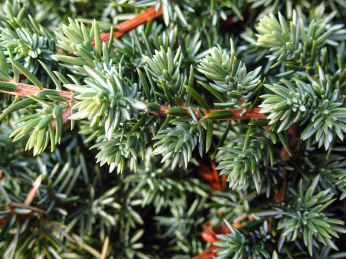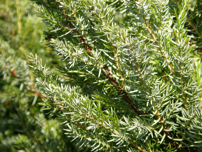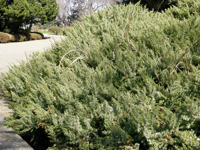 | 形態 | 幹は風の強い場所では匍匐し、弱い場所では直立する。樹皮は赤褐色で縦に長く裂ける。葉は灰緑色の針形で、3輪生する。葉の表面に、2本の白い気孔線が入る。雌雄異株で、3〜4月頃、それぞれ枝先の葉腋に雌花や雄花をつける。果実は球形の球果で、ワックス質に覆われた灰青色に熟す。 |