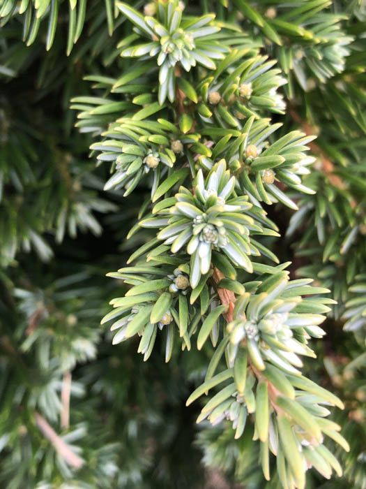 | 形態 | 匍匐性で、横に這い広がる。葉は3輪生の針形で、葉裏は2本の気孔線がある。触っても痛くない。果実は球形の球果で、紫褐色に熟す。 |