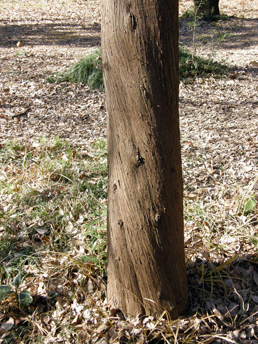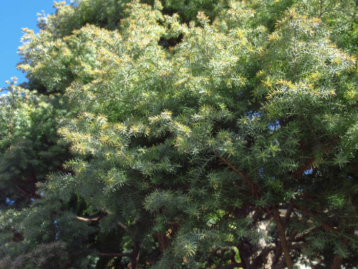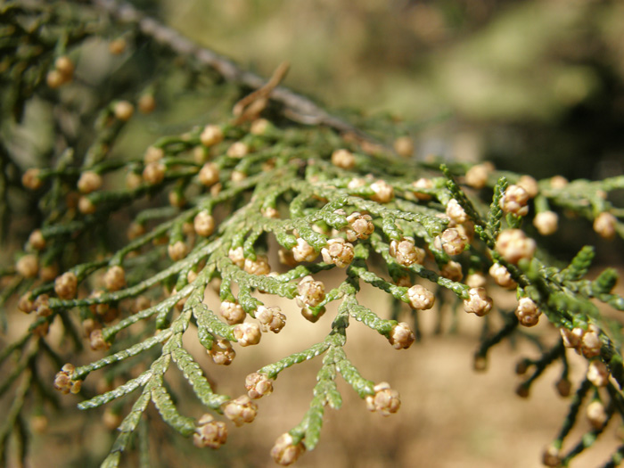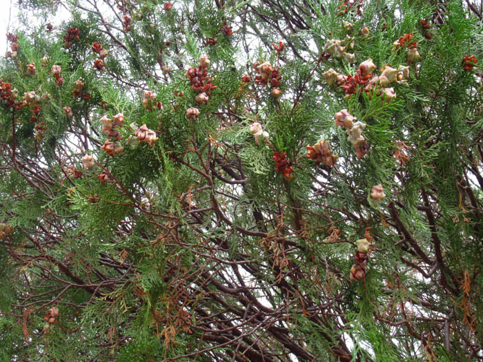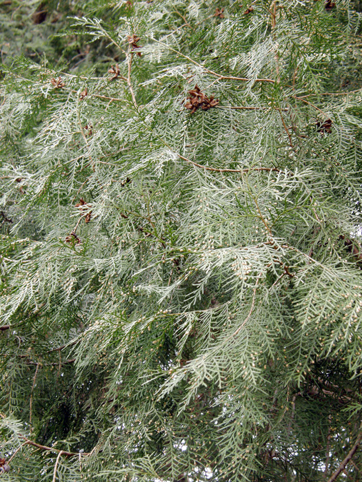 | 形態 | 幹は直立し、樹形は円錐形になる。樹皮は赤褐色で縦に長く裂ける。葉のついた枝は平面的。葉はくすんだ緑色で、鱗片状で先端がやや尖り、表裏の区別は無い。雌雄異花で、2~3月頃、枝先に雌花と雄花をそれぞれ単生する。雄花はほぼ球形で薄黄褐色、雌花は鱗片状で淡紫を帯びた薄茶色の葉の塊のよう。果実は4本の角が出た球形~長球形の球果で、若いうちは灰緑色で、10~11月頃に熟すと割れて褐色の内側が露出し、4個の種子が出る。 |