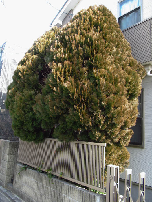 | 解説 | 樹高は5m程度。樹形は狭円錐形。枝や葉は密生し、平面的な枝が縦に規則正しく並ぶ。葉色は、新芽は黄金色で、夏は緑色、冬は赤茶色になる。寒さに弱い。 |