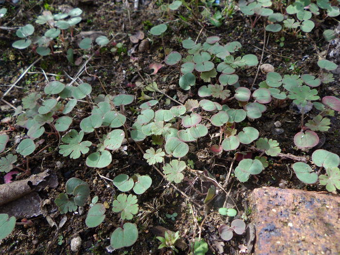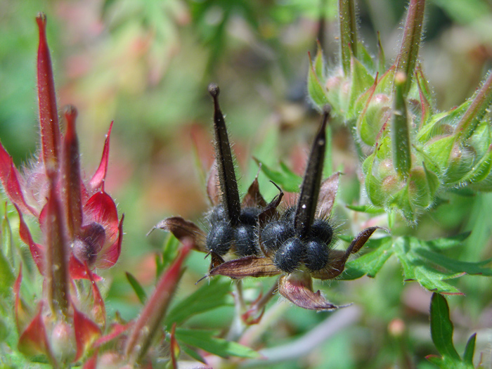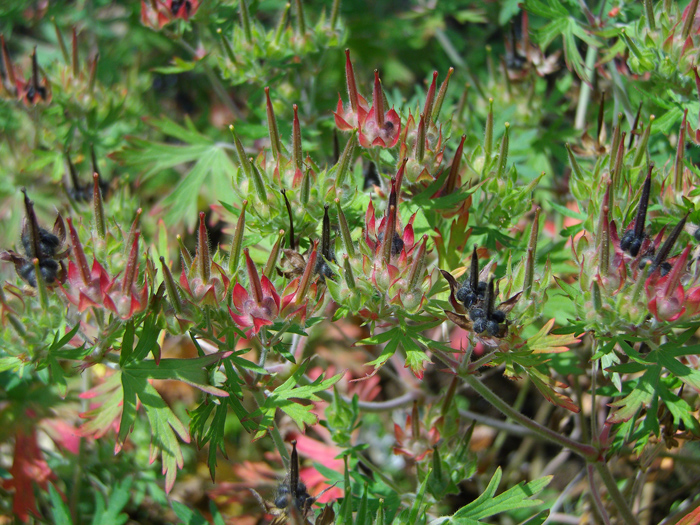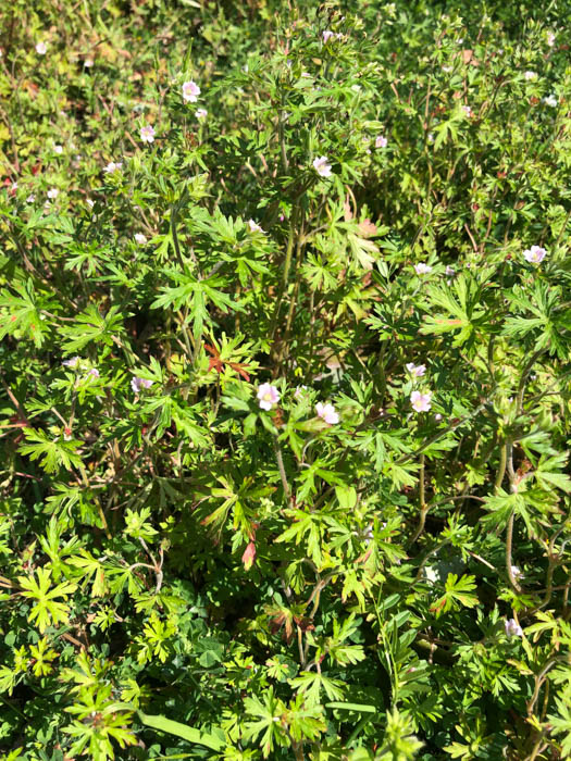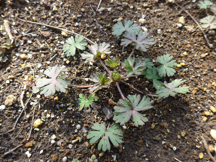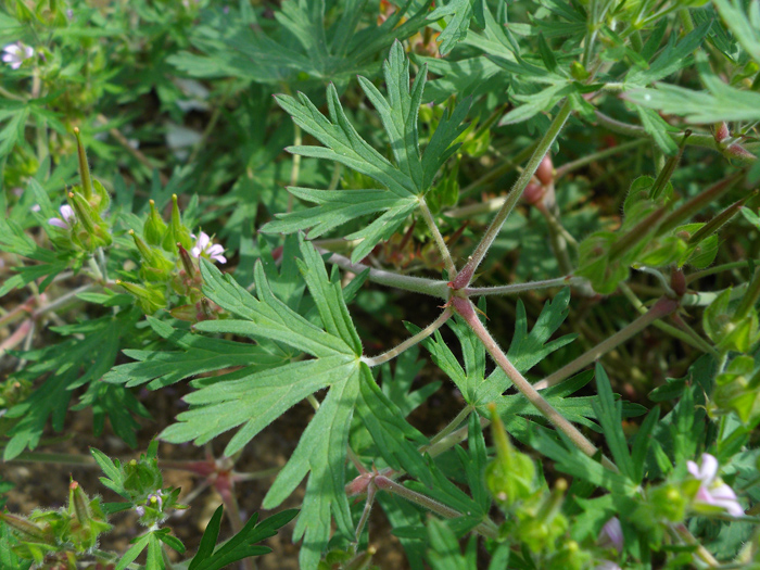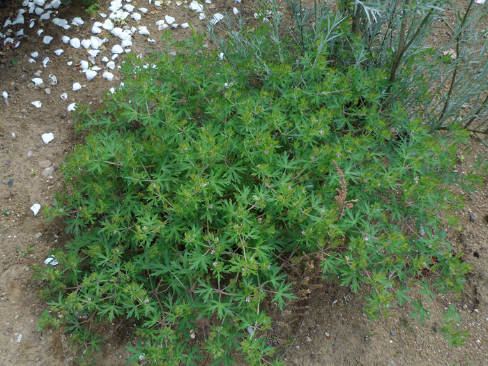 | 形態 | 秋に芽生え、ロゼット状で越冬し、春に茎を立ち上げる。茎は基部からよく分枝してこんもりと広がる。茎には軟毛が密生する。葉は掌状に5~7深裂し、裂片は先の方で3裂する。葉縁は紫色を帯びる。長柄があり、対生する。5月頃、葉腋から短い花柄を出し、薄桃色の5弁花を2個ずつつける。果実は蒴果で、6月頃には黒く熟し、裂開して反り返り、種子を弾き飛ばす。 |