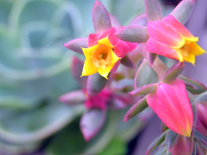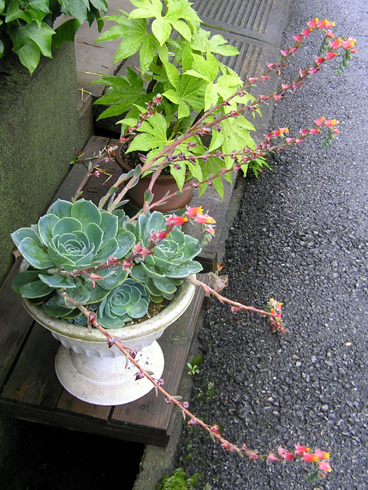 | 形態 | 短い茎に葉が螺旋状に互生し、ロゼット状にまとまってつく。葉はやや肉厚の幅広のサジ形で、粉っぽい青緑色で、先端はピンク色で棘状に尖る。初夏頃、ロゼットの中から長い花茎を伸ばし、花序を作り、朱桃色で先端および内側が黄色い5弁花を咲かせる。花は平開せず、花弁先端は尖る。 |