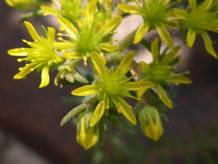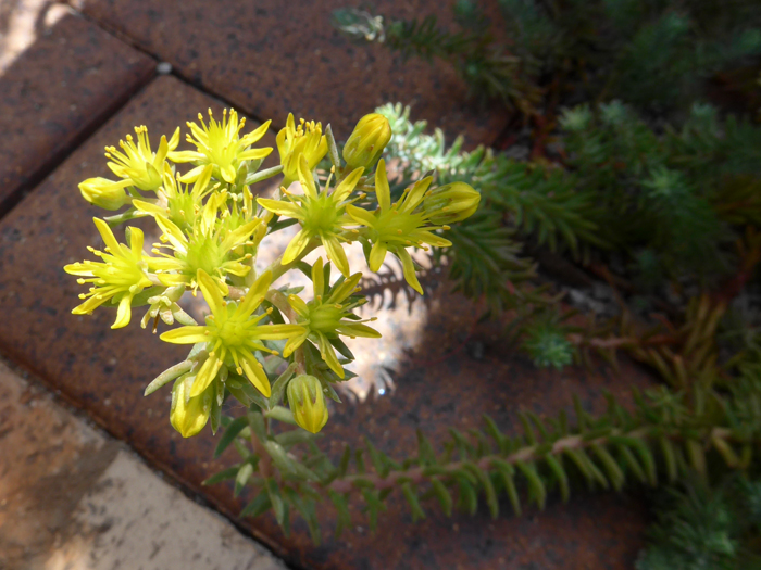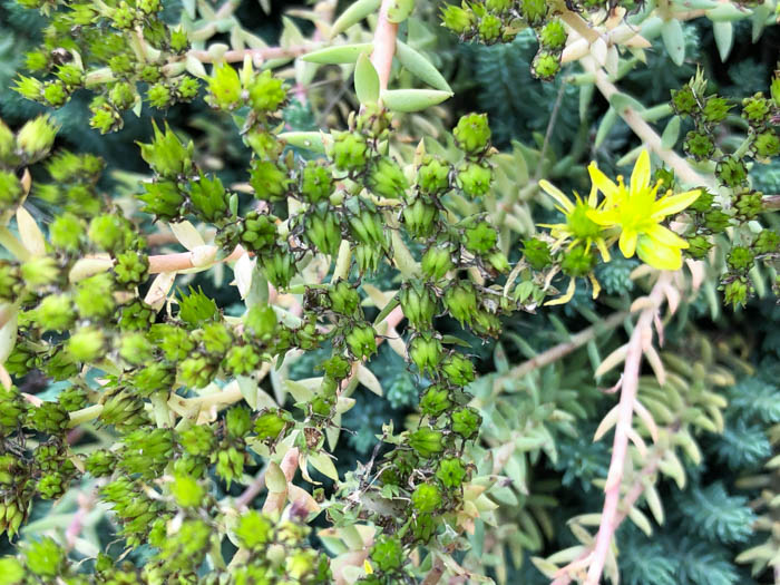 | 形態 | 茎を長く伸ばし地面を匍匐して横に広がり、先端は斜上する。葉は粉っぽい灰緑色で、多肉質の披針形で、螺旋状に互生する。7月頃、黄色い6弁花を咲かせる。 |