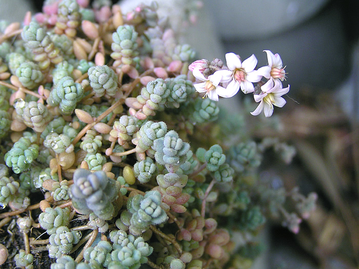 | 形態 | 地面を匍匐して横に広がり、先端は直立または斜上する。葉は粉っぽい灰青緑色で、細かい毛が生え、多肉質の卵形で、密に対生する。5~6月頃、茎頂に花序を作り、くすんだ桃色〜白色の5弁花を咲かせる。花弁は先が尖った楕円形〜披針形。冬季は葉が赤味がかる。 |