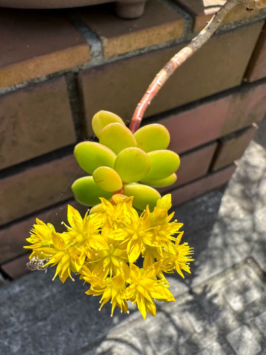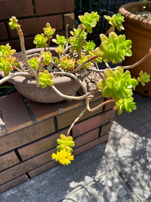 | 形態 | 茎は地際からよく分枝し、直立斜上するが、次第に倒れて匍匐下垂して広がる。葉は光沢がある黃緑色で、寒さにあたると赤味がかり、多肉質の倒卵型で、螺旋状に互生し、茎頂に集まる。4月頃、茎頂に花序を作り、黄色い5弁花を咲かせる。花弁は披針形で先は鋭く尖る。 |
