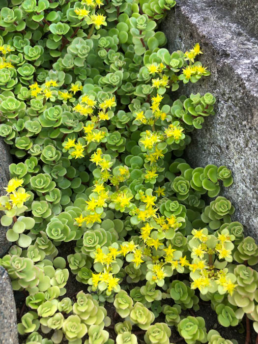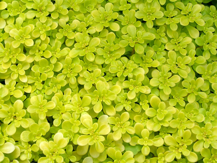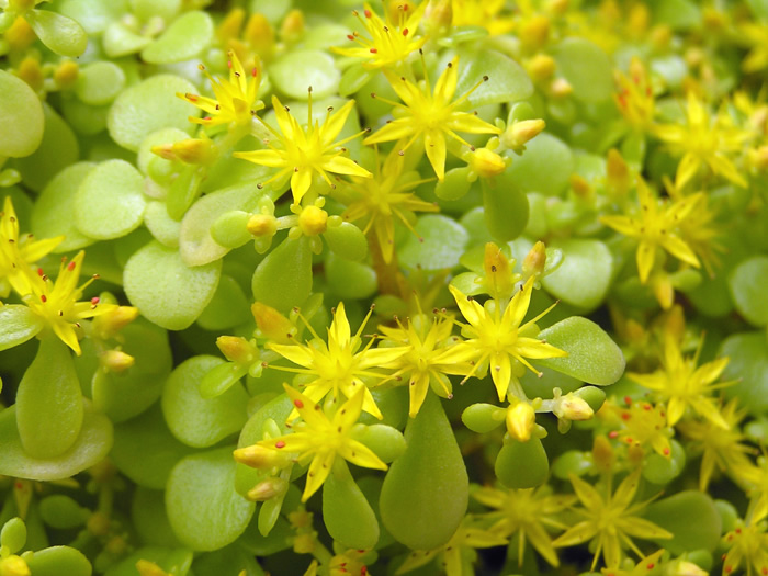 | 形態 | 地面を匍匐して横に広がり、マット状に群生する。葉は黄緑色で、多肉質の円形で、螺旋状に互生する。6月頃、茎頂に花序を作り、黄色い5弁花を咲かせる。花弁は披針形で先は鋭く尖る。 |
