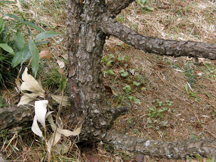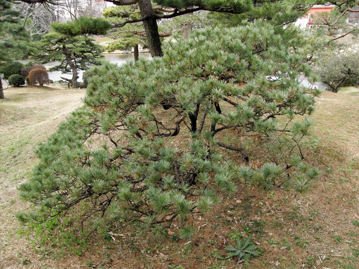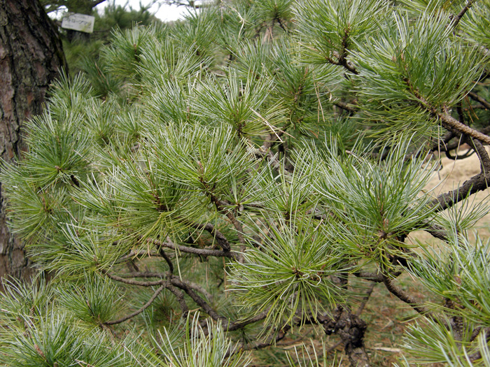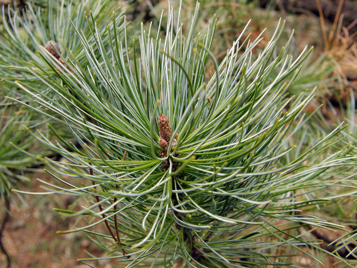 | 形態 | 枝は横に這うように伸び、ところどころに根を下ろしながら風下方向に成長するが、無風の場所だと立性の樹形になる。樹皮は暗褐色で亀甲状に割れ目が入りはがれる。枝は水平に出る。葉は細長く柔らかい針状で、5本が対になった五葉松。表面は濃い緑色で裏面に白色の気孔線がある。6~7月に、1年枝の基部に多数の赤い雄花が、先端に赤褐色の雌花が1~3個つく。球果は卵状長楕円形で、翌年の秋に熟す。種子には翼が無く、動物散布される。 |