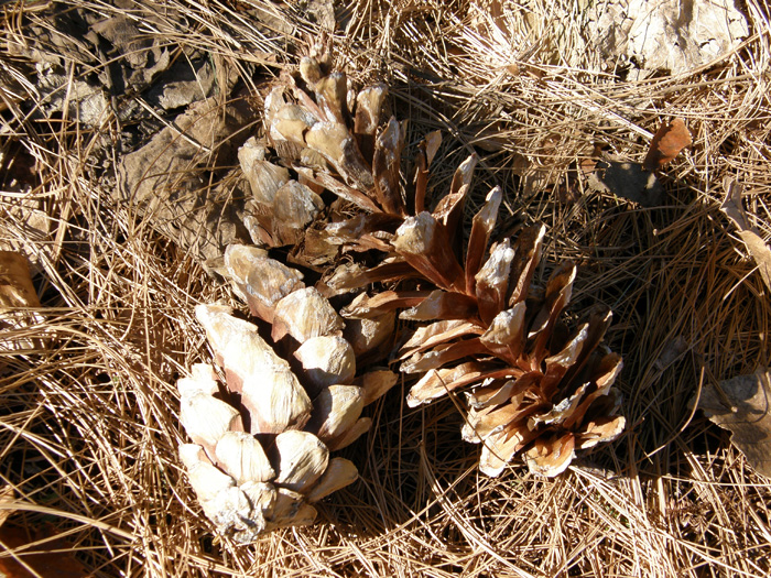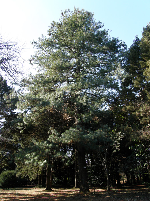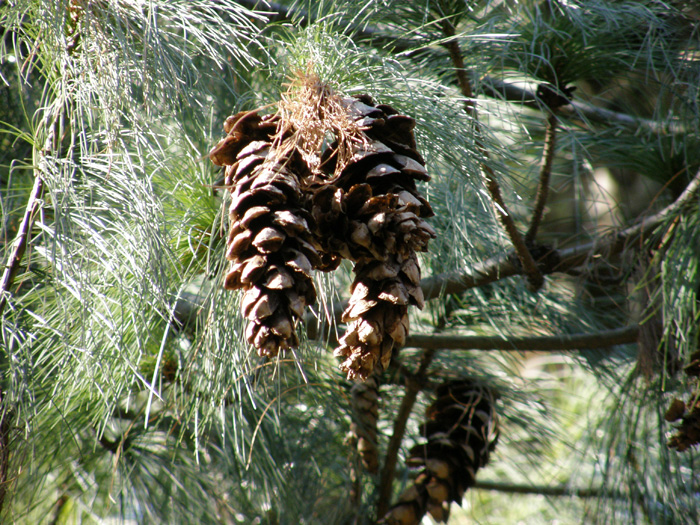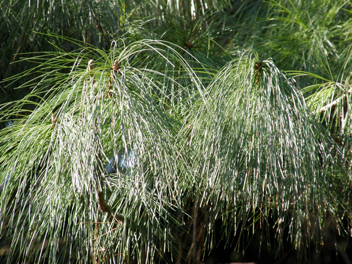 | 形態 | 葉は針状で、5本が対になった五葉松で、長い葉が垂れ下る。花は5月頃に開花し、翌年の秋に細長い球果に育つ。 |