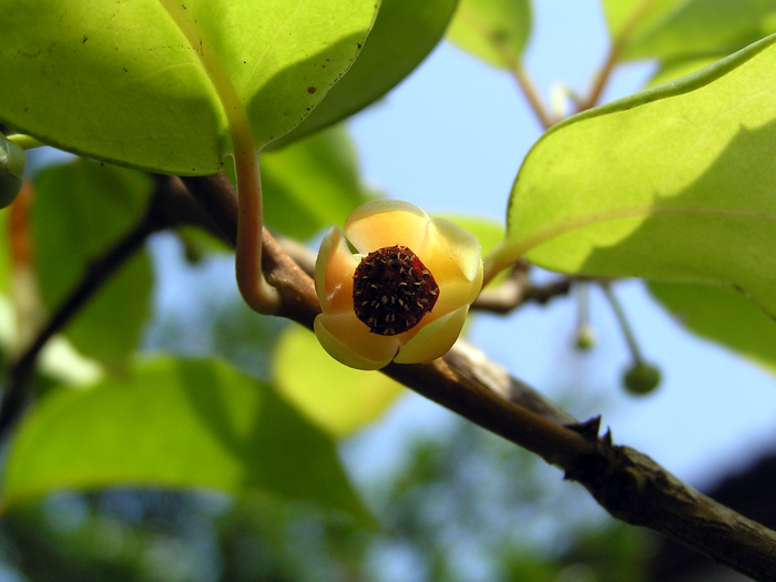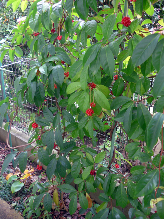 | 形態 | 葉は、先端が尖った楕円形で、浅い鋸歯があり、互生する。葉は、濃緑色で厚く光沢があり、裏面はやや紫色を帯びる。8月頃、葉腋から柄を出し、淡黄白色の花を下向きにつける。雌花は中心に淡い緑色の雌しべが小球状に固まってつき、雄花は紅色の雄しべが小球状に固まってつく。雌花の花床は膨らんで、球形の集合果になり、10~12月頃、赤く熟す。 |
