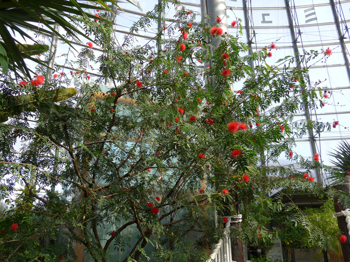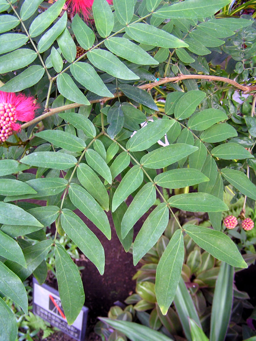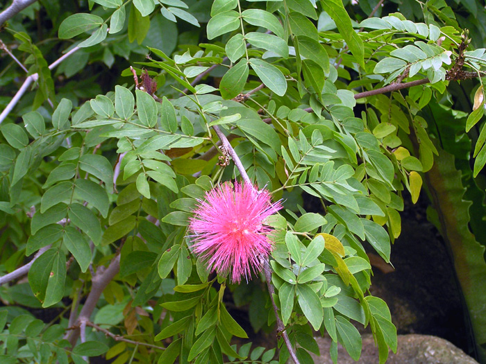 | 形態 | 葉は小羽片5~7対、小羽片の集まった小葉1対からなる2回偶数羽状複葉で、互生する。小羽片は先がやや尖ったいびつな長楕円形。12~翌5月頃、枝先の葉腋に数個の頭状花序を作る。赤色で長い糸状の雄しべが長く突き出た花が数十個集まってほぼ球形になる。 |