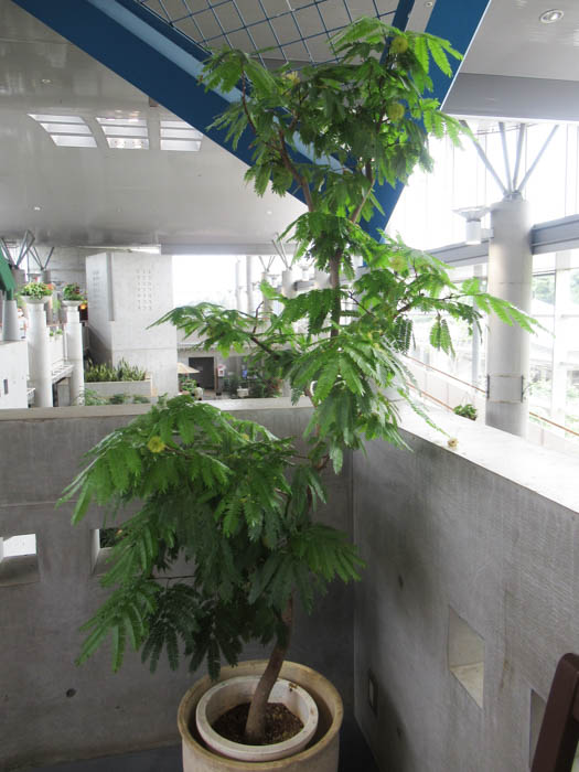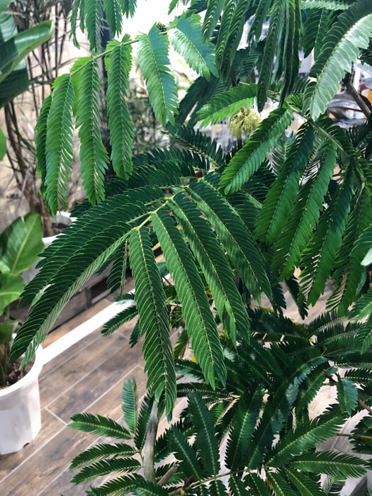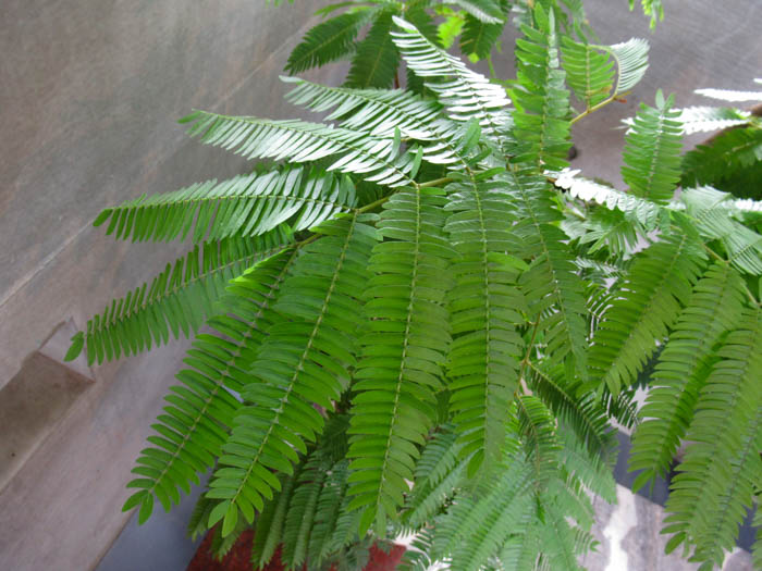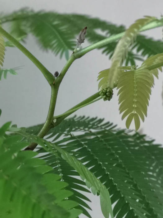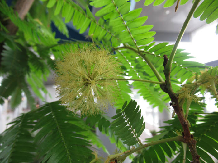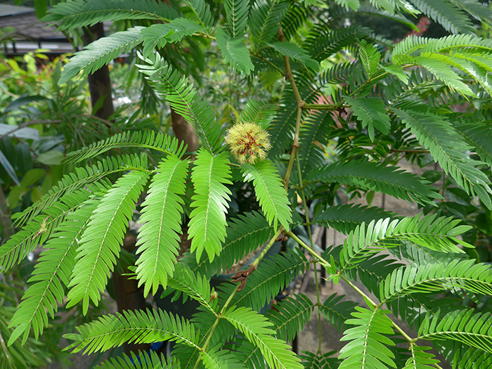 | 形態 | 幹は直立する。葉は光沢があり、小羽片20~30対、小羽片の集まった小葉2〜8対からなる2回偶数羽状複葉で、互生する。葉は夕方になると相対する小葉が合わさって閉じてしまう就眠運動をする。4~9月頃、枝先の葉腋に頭状花序を作る。クリーム色の雄しべがブラシ状に出た花が数十個集まってほぼ球形になる。果実は鮮赤色の豆果で、種子ひとつずつにくびれが入り、熟すと莢がよじれて、光沢がある黒い球径の種子が出てくる。種子は8~15個が入る。 |