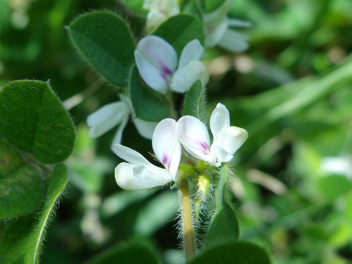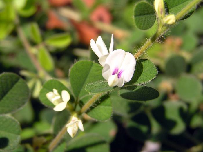 茎は地を這って広がる。全体に軟毛が生える。葉は3出複葉で互生。小葉は楕円形~円形で長い軟毛が目立つ。9~10月頃、葉腋に2〜4個の蝶形花を咲かせる。花は白色で、旗弁の根元に紅紫色の斑紋が入る。
