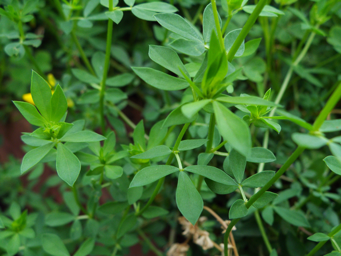 | 形態 | 茎は根元から分枝し、地表を匍匐して成長する。葉は3出複葉で、葉柄の基部に2枚の托葉がつき、互生する。小葉は粉っぽい緑色で、卵形~楕円形で、全縁。茎、葉、萼には毛がある。4~8月に葉腋から花柄を出し、3~7個の黄色い花を咲かせる。萼は筒状で先は裂け、萼片は萼筒より短いか同長。果実は豆果で、細長い円柱形。熟すると二つに割れて種子を散布する。 |