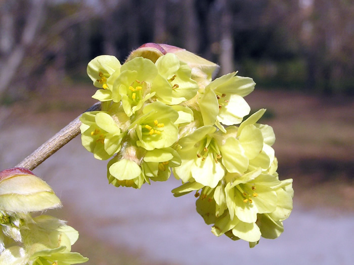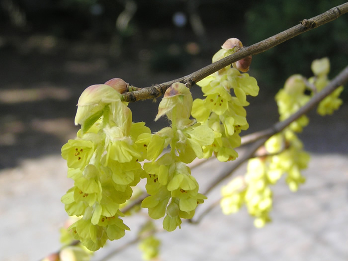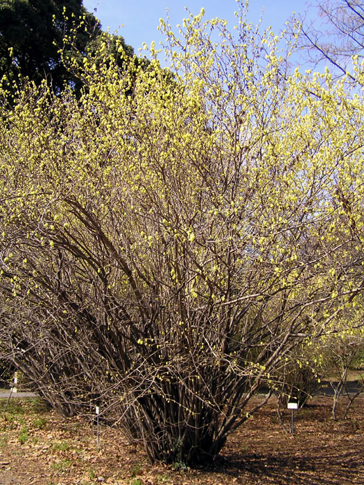 | 形態 | 枝は細く、よく分枝し、株立ち樹形になる。葉は先が尖った円形〜楕円形で、浅い鋸歯があり、互生する。3~4月頃、葉の展開に先立って、10~15個の花からなる花序を作り、芳香のある薄黄色の花をぶら下げるように咲かせる。花弁は5枚、雄しべは5本で、葯は山吹色。雄しべは花弁よりも短い。果実は広倒卵形の蒴果。 |