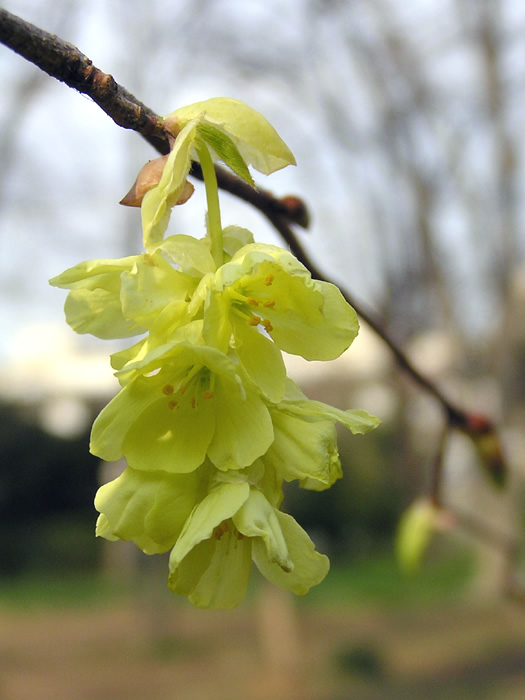 | 形態 | 枝は細く、上部でよく分枝する。葉は先が尖った円形〜ハート形で、葉脈に沿って凹凸があり、芒状の鋸歯があり、互生する。3~4月頃、葉の展開に先立って、7~10個の花からなる花序を作り、薄黄色の花をぶら下げるように咲かせる。花弁は5枚、雄しべは5本で、葯は山吹色。雄しべは花弁よりも短い。果実は広倒卵形の蒴果。 |