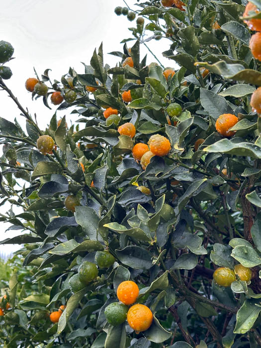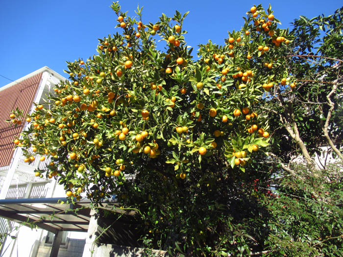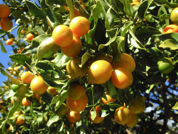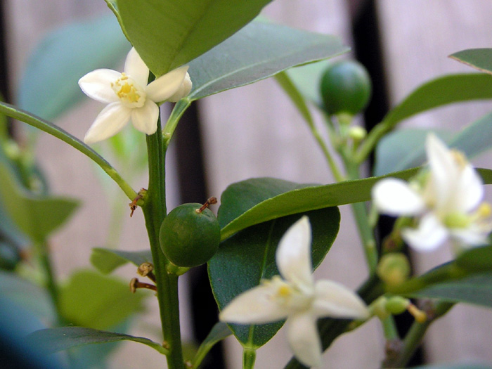 | 形態 | よく分枝し、枝にはほとんど棘がない。葉は厚みのある長楕円形で葉先に浅い鋸歯があり、葉柄にはごく小さい翼がある。裏面には多くの油点が見られる。7~10月頃、3~4回に分けて、白い5弁花を咲かせる。果実は楕円球形の液果で、冬に橙色に熟す。花期がばらけているので果実の熟し具合もばらけている。 |
