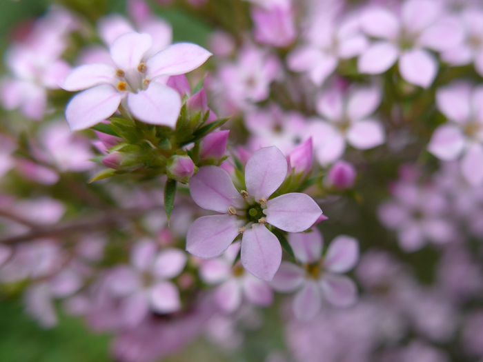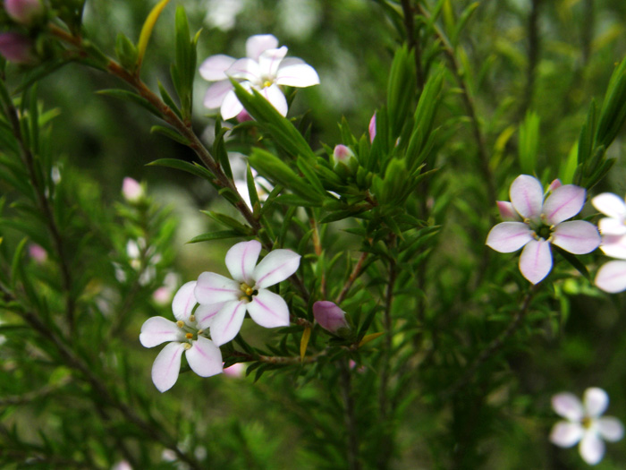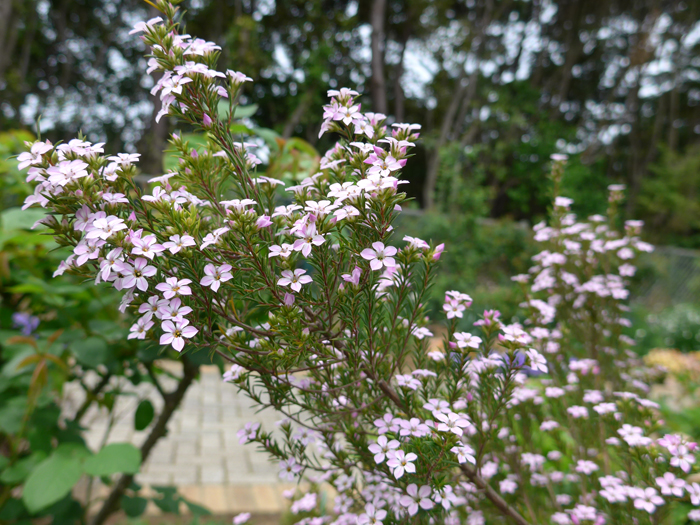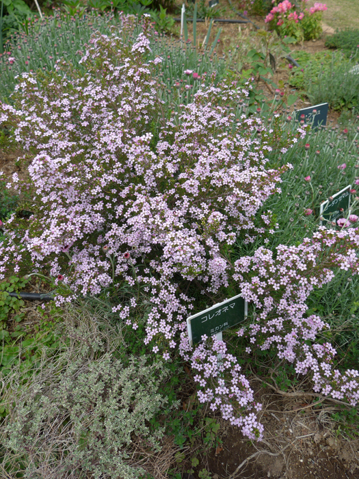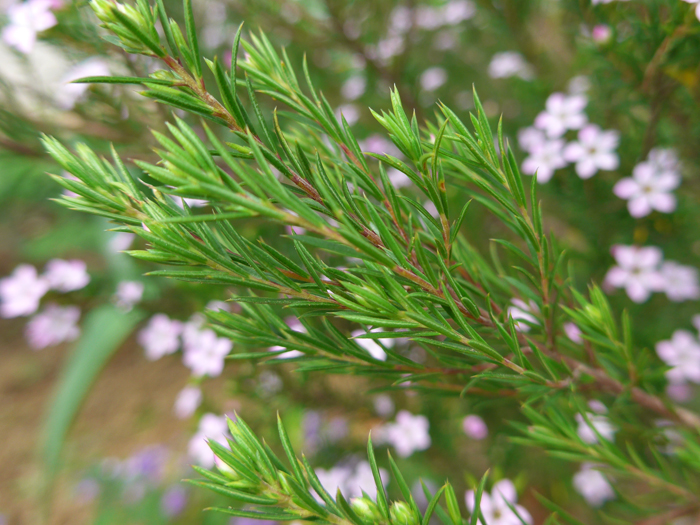 | 形態 | 幹は直立し、株元からよく分枝する。葉は線形で、互生する。葉は揉むと柑橘系の香りがする。2〜5月頃、葉腋にピンク色の5弁花をたくさん咲かせる。 |