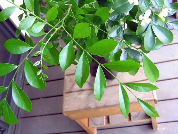 | 形態 | 幹は直立し、株元からよく分枝する。樹皮は灰白色で、縦に薄くはげる。葉は小葉4~7対+1枚からなる奇数羽状複葉で、互生する。小葉は光沢のある緑色〜深緑色の、先がやや尖った長倒卵形〜長楕円形で、全縁。7~8月頃、葉腋や枝の先端に集散花序を作り、芳香がある白花を咲かせる。暖地では、周年開花が見られる。果実は液果で、赤く熟する。 |