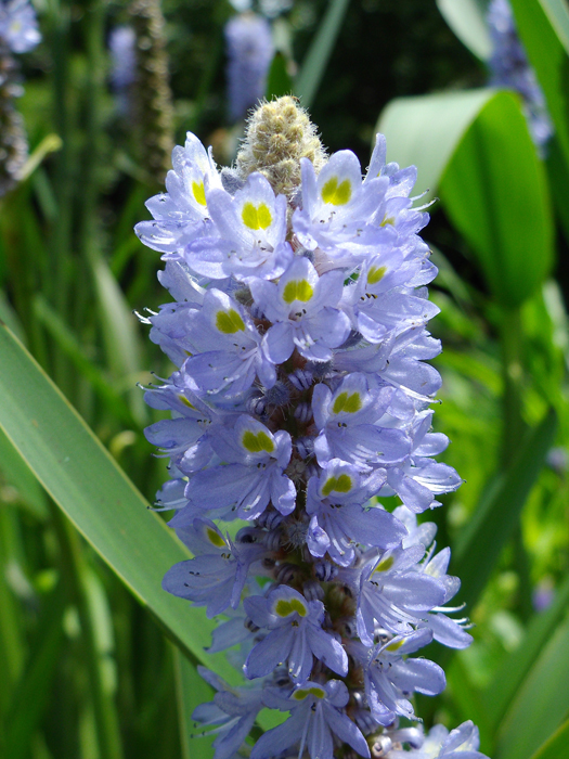| 形態 | 水中の土中に太い根茎を伸ばして大きな群落を形成する。根茎から葉柄を伸ばし、細長いハート形の葉をつける。6〜10月頃、穂状花序を作り、淡青紫色の花を咲かせる。花は6弁で、上部の花弁1個に黄緑色のスポットが入る。花後、茎が折れ曲がって花序は水没する。 |