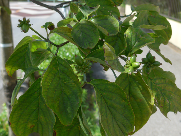 | 形態 | 樹皮は暗い灰褐色で、縦横に亀裂が入る。葉は対生し、側脈が明瞭。全縁で、縁はやや波打ち、裏面全体には白色の毛があり、特に脈上には毛が多い。秋に紅葉する。4~5月に、葉の展開とほぼ同時に開花する。花弁のように見えるのは総苞で、白、または桃色になり、先端が、内側にくぼむ。中心の塊が頭状花序で、黄緑色の小さな花15~20個が集合している。果実は長球形の核果で、9月頃に朱色に熟し、落葉後も長く枝にとどまる。 |