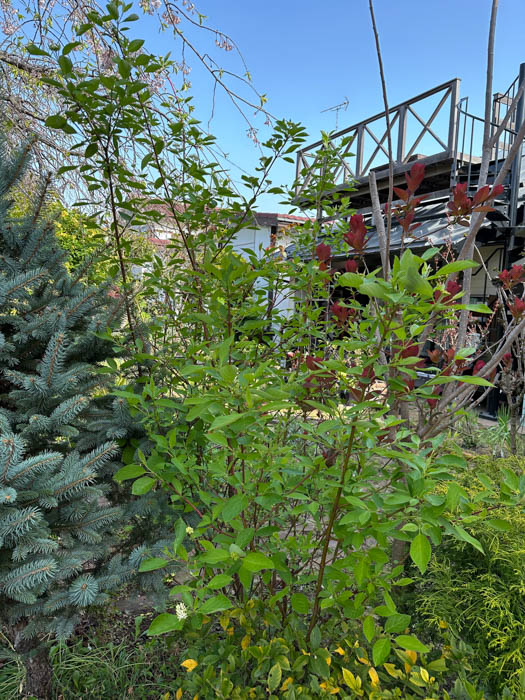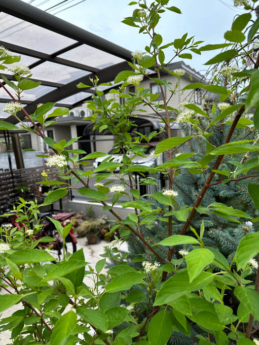 | 形態 | 株立樹形で、細い枝がたくさん叢生し、株元から分枝する。若枝は冬季に赤や臙脂色に発色する。葉は先が尖った広卵形~広惰円形で、全縁で、対生と互生が混ざる。葉は緑色で、秋に赤〜橙色になって落葉する。4〜5月頃、新枝の先に散形花序を作り、花弁が4枚の白い小花を咲かせる。果実は球形の核果で、6〜8月頃、白く熟す。 |