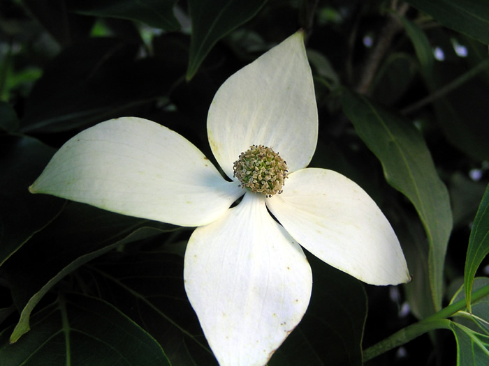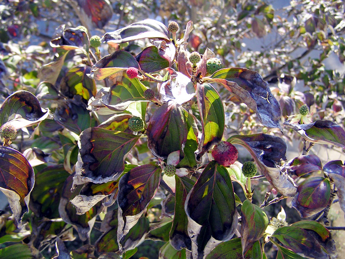 | 形態 | 幹は直立し、多く枝分かれする。樹皮は褐色で、成木になると不規則に丸く剥がれてまだら模様になる。葉は対生し、側脈が明瞭。全縁で、縁はやや波打つ。秋に紅葉する。5~7月頃、枝先に長い花柄を出し、花を咲かせる。花弁のように見えるのは4枚の総苞で、中心にある球状の花序に小花を20~30個つける。総苞は先が尖った舟形で、白色。9~10月頃、核果が球状に集まった集合果ができ、赤色に熟す。 |