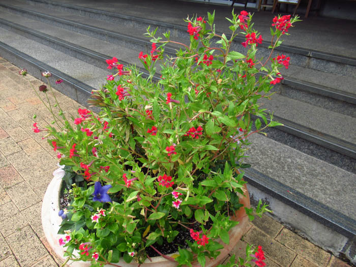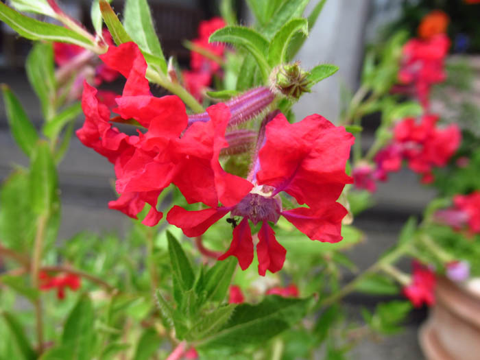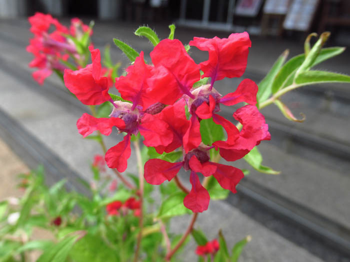 | 形態 | 茎は直立し、株元からよく分枝し、基部は木質化する。茎や葉には毛が生える。葉は先が尖った狭卵形〜披針形で、対生する。7~10月頃、対生する葉の付け根に1個の花を咲かせる。萼は紫色の細長い筒状で毛が生える。花弁は6個で、2個が大きく他の4個は小さい。花弁は赤く、皺があり、基部は細い線状で紫色の筋が入る。 |