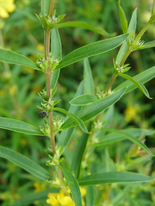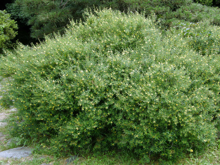 | 形態 | 茎は直立し、株元からよく分枝し、基部は木質化する。葉は全縁の披針形で、十字対生する。6〜7月頃、葉脇に黄色い花を咲かせる。花弁は6個で、皺がよっている。果実は蒴果。 |