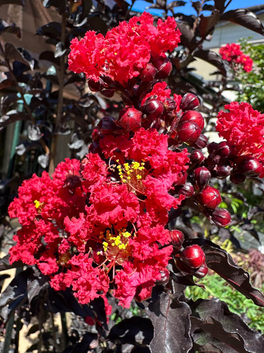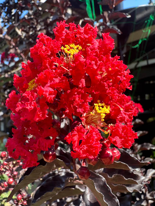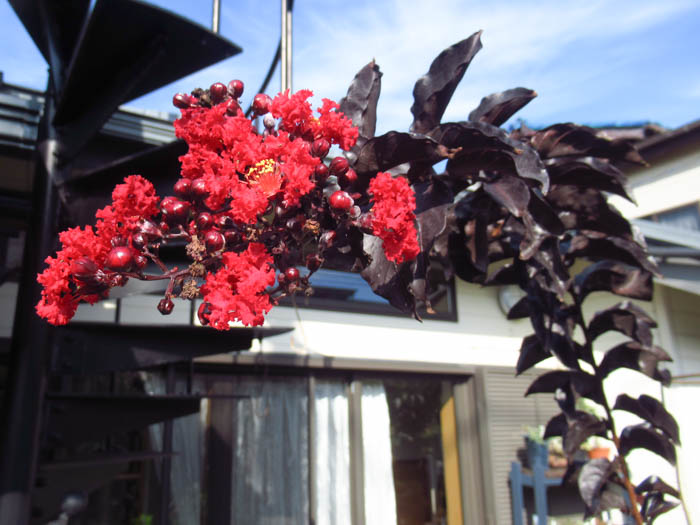 | 形態 | 低い位置から枝分かれしたり、株立ちになる。幹は若いうちは黒っぽく、成長に伴って淡褐色になり、やがて樹皮が剥がれ落ち、中の灰白色の樹皮が現れて斑模様になる。若い枝や葉は黒紫色。葉はやや光沢があり、楕円形で、全縁で縁がやや波打ち、葉柄は無く、対生と互生が交じる。7~9月頃、枝の先端に円錐花序を作り、縮れた花弁の花を咲かせる。花は真紅、紅紫色、淡紅紫色、白色など。花弁は6枚で、萼は6裂する。雄しべは多数あり、外側の6本が長く、雌しべは1個。 |