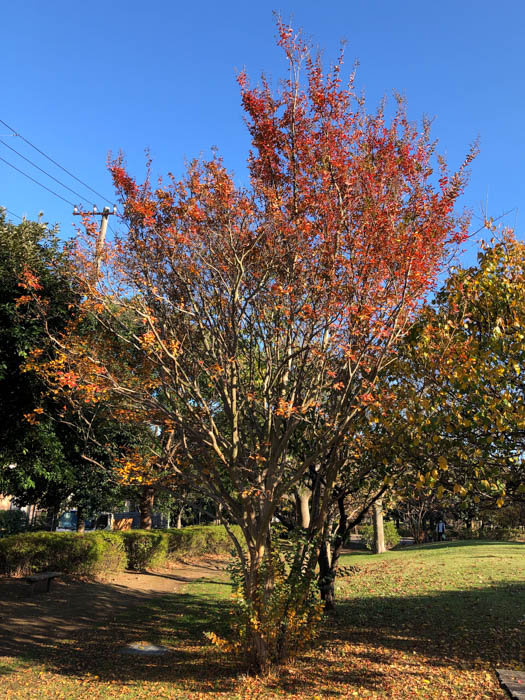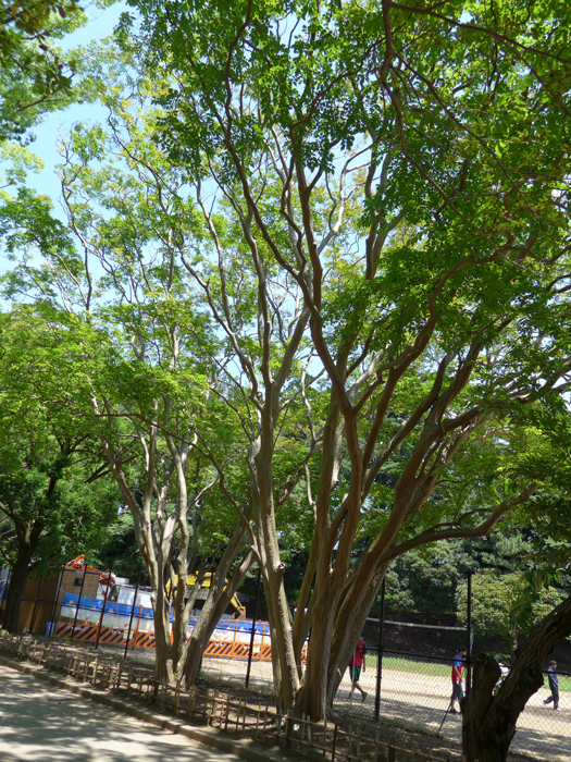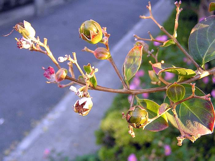 | 類似 | 「サルスベリ」は幹が株立ち状になる。葉の先端は丸いもの、尖ったもの、凹んだものが混じる。葉柄が無い。花が大きい。花期が長い(7〜9月)。 「シマサルスベリ」は主幹が直立する。葉の先端は尖る。葉柄がある。花が小さい。花期が短い(7〜8月)。 |