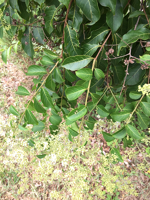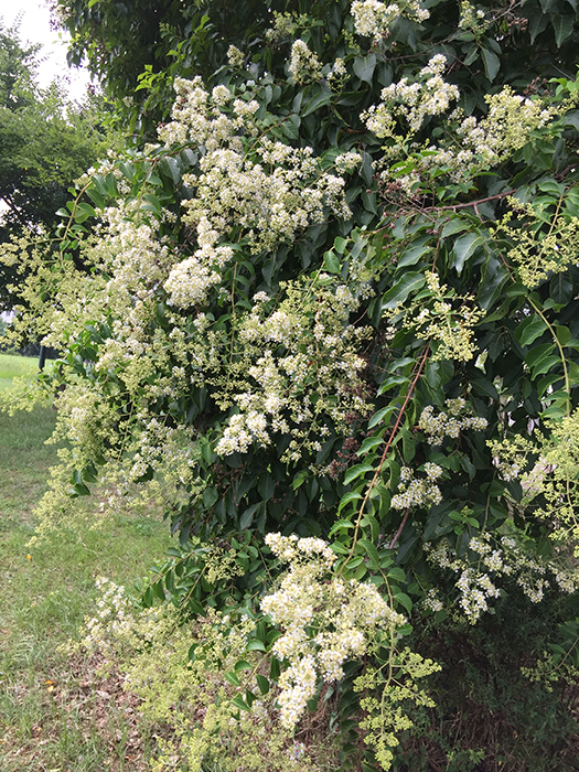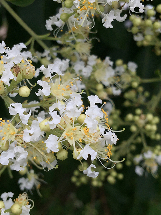 | 形態 | 主幹が直立し、よく分枝する。幹の成長に伴って淡褐色の樹皮が剥がれ落ち、灰白色の樹皮が現れて斑模様になる。葉は先が尖った楕円形で、全縁で、2〜3mmの葉柄がある。右、右、左、左と2枚ずつの葉が互生するコクサギ型葉序。7~8月頃、枝の先端に円錐花序をつけ、縮れた白色の花弁の花を咲かせる。果実は卵形の蒴果。 |